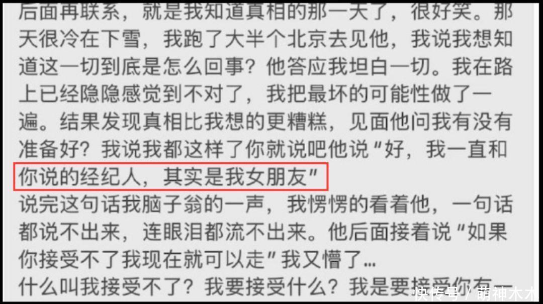 女生完全无法接受这个事实,之后一个人跑到北京找梓渝。此时她终于得到对方的亲口承认,称经纪人其实是他的女友,而且两个人已经保持了两年的恋爱关系。也就是说,当初梓渝和女生交往的时候,其实是脚踩两条船的。