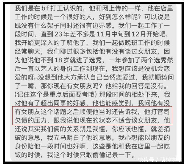 对方在爆料中讲述了二人认识的日常,称他们是在某品牌“一日打工店”和梓渝认识的,在相处的过程中产生了好感。由于梓渝新签约的经纪公司在北京,日常活动在全国各地,所以在短暂工作后,需要回到公司。女生称,自从他回到北京后,就开始了失联。后来梓渝解释,是经纪人需要没收手机。关于这一点,梓渝在和女生分别之前,也提前做过解释。