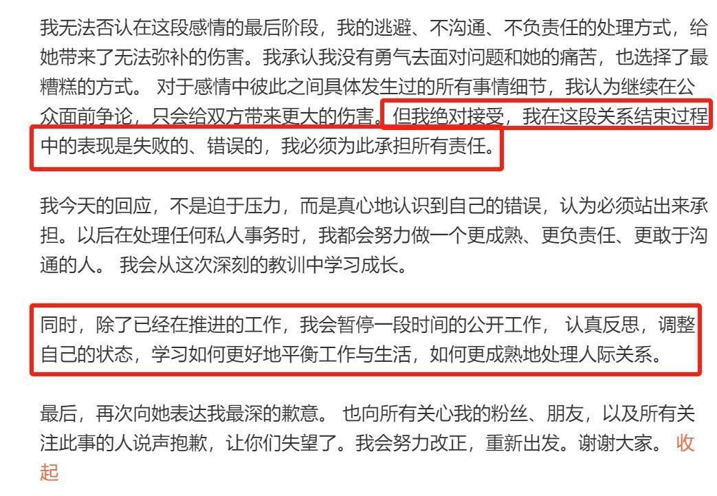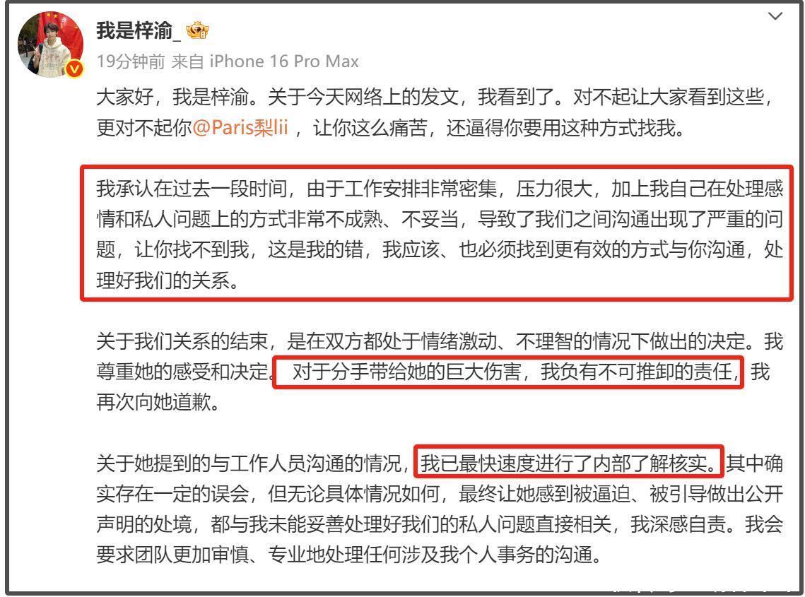 随后,梓渝本人火速发声回应,表示自己在处理感情和私人问题上的方式非常不成熟、不妥当,导致了他们之间沟通出现了严重的问题,并承认分手是在双方都处于情绪激动、不理智的情况下做出的决定。对于分手带给女方的巨大伤害,他负有不可推卸的责任,因此再次向她道歉。