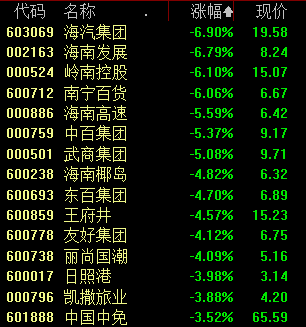 南宁百货、海南发展、海汽集团、岭南控股跌逾6%,海南高速、中百集团、武商集团跌逾5%。