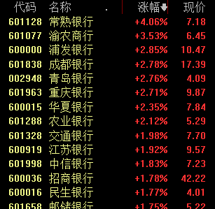 常熟银行涨超4%,渝农商行涨超3%,浦发银行、青岛银行、成都银行、重庆银行、华夏银行等涨超2%。